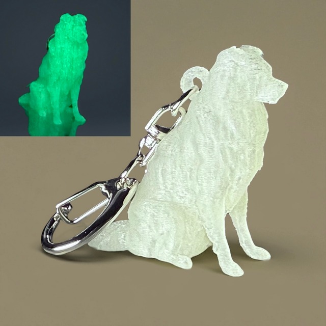 わんこチャームシリーズ TOLチャーム TOLボーダーコリー ↑これらの文字で検索すると同じシリーズの製品が直ぐに表示できます 【製品説明】 ボーダーコリーのリアルな3Dフォルムのミニフィギュアチャームです。 明るい場所では、ツヤがあり、飴細工・水飴のような見た目となります。 材料に蓄光(夜光)の植物性樹脂を使用しており、暗い場所では、蓄えた光の量によって緑色に輝きます。光の強さや光る時間は当てた光の強さや時間によって変化いたします。 強く輝かせたい時は直前にブラックライトや日光や蛍光灯など紫外線を多く含む強い光を充分に当てると明るく輝きます。 キーホルダー や バッグチャーム等のアクセサリ、 オブジェとしてやオーナメント等にも自由にお使いください。 暗い所で物を見つけ易くする事もできます。鍵等だけでなく、防災用品の近くに置くなどいろいろな用途にどうぞ。 キーホルダー金具付です 【製品概要】 サイズ:4cm × 4.1cm ×1.8cm 材質:蓄光植物性樹脂 ※リアルなシルエットと、表面に曲面立体加工を施した複雑なフォルムとなっております。表面に木目風の模様がついております。詳細は写真でご確認お願いいたします。 ※本作品は 業務用3Dプリンタで繊細な形状に製作した部品を用いて手作業で組み立て加工を施した作品です。積層痕(表面の縞や凹凸、小さな傷、バリ等)が処理を行っても残ってしまいますので、生成状の特性としてご了承くださいませ。無塗装の素材そのままの色を用いており、色剥がれがなく末長くご利用になれます。 ※熱に強くはありませんので、暖房器具や暑くなる場所には近づけないで下さい。(耐熱温度60℃) ※精緻なデザインですので、細部などの取り扱いや、小さなお子様やペット等が触れないよう充分お気をつけて下さい #犬 #キーホルダー #チャーム #アクセサリー #クリスマスツリー #オーナメント #わんこプレートシリーズ #ボーダーコリー