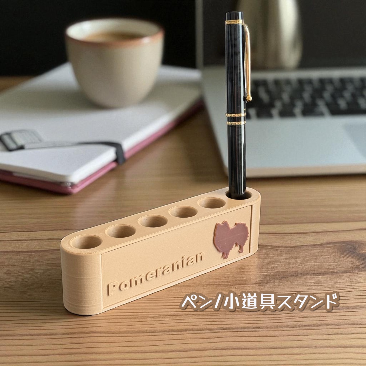 可愛いポメラニアンのリアルなシルエットが付いている、【カード/名刺スタンド】、【ペン/小道具スタンド】です。