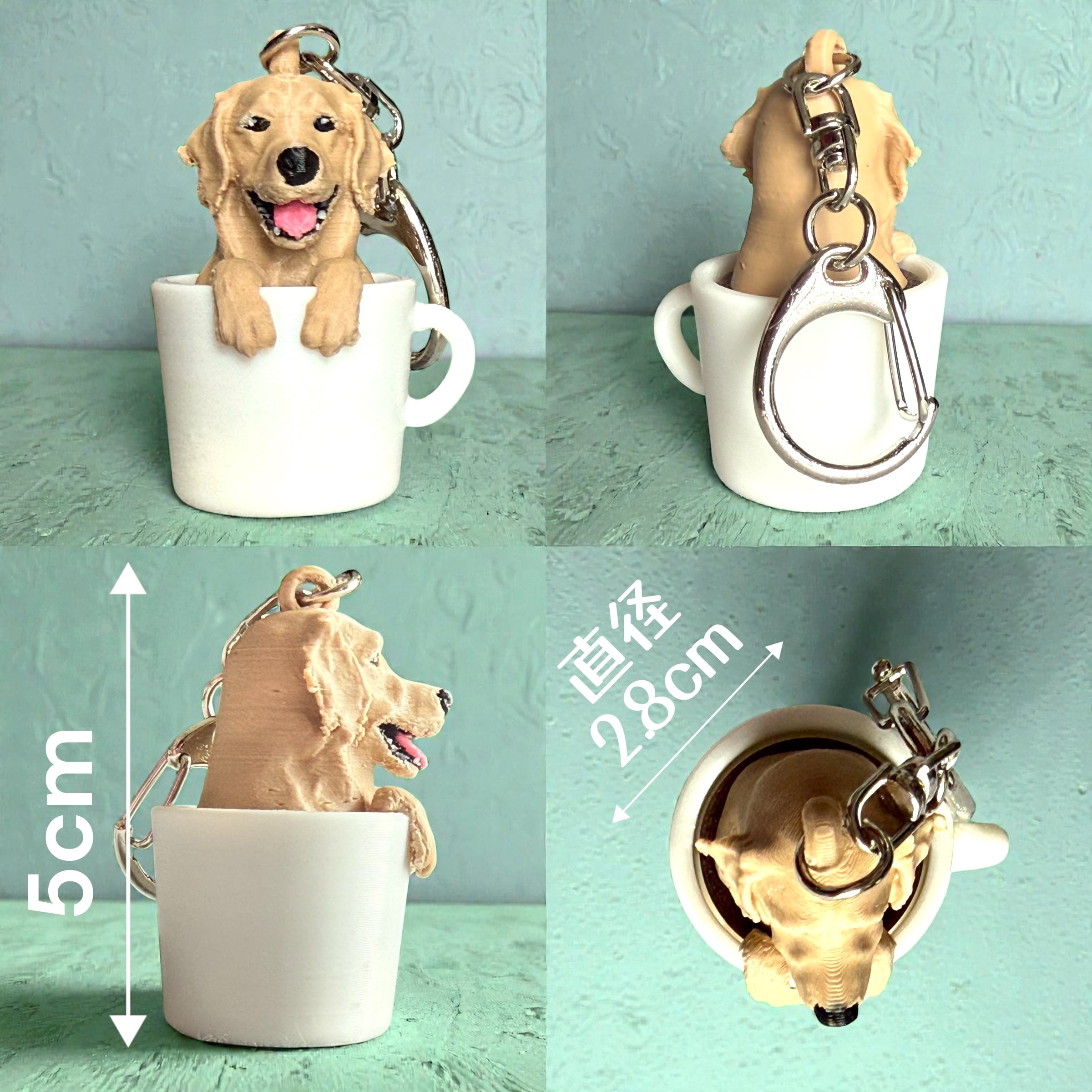 ゴールデンレトリバーがカップでくつろいでいる、カチカチと音のするクリッカー フィジェット機能付きの愛らしいキーホルダーです。