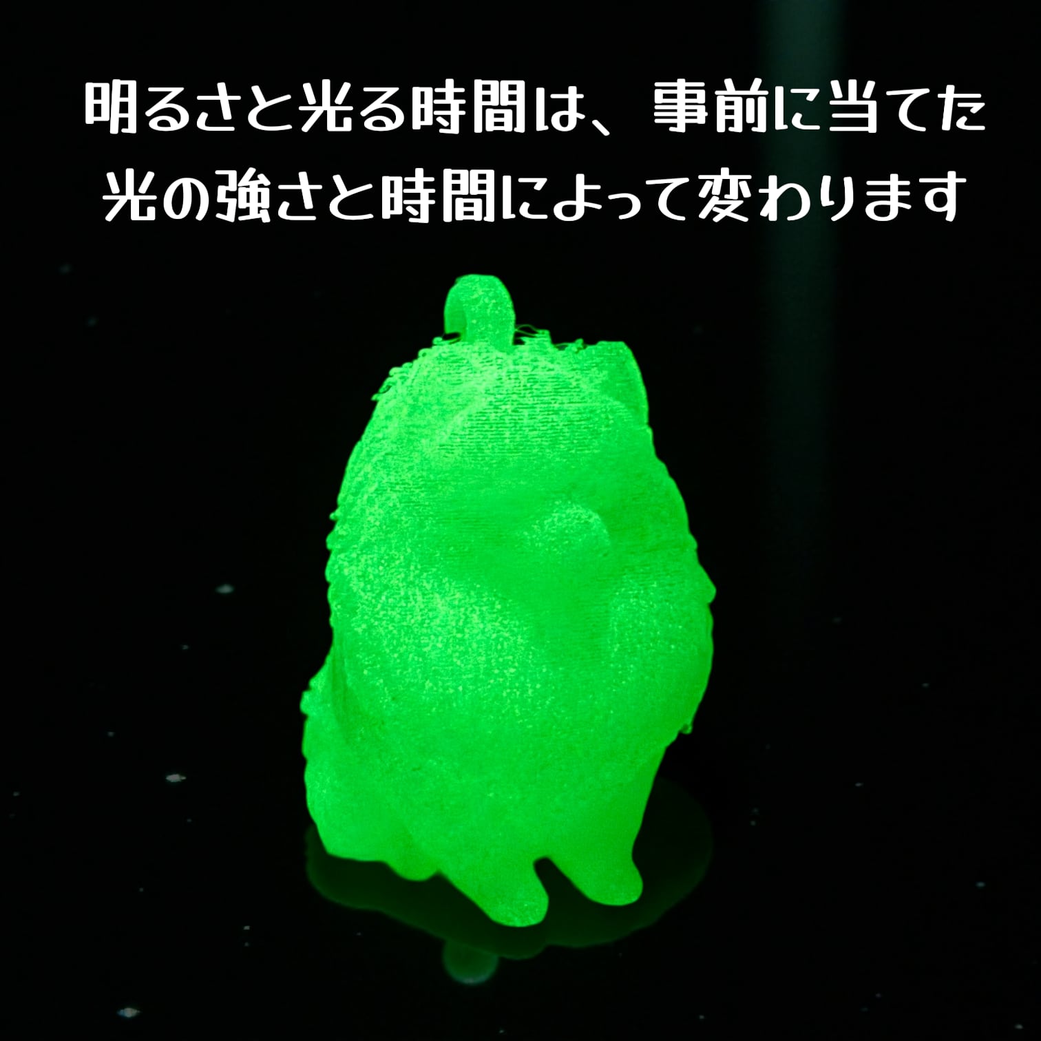 材料に蓄光(夜光)の植物性樹脂を使用しており、暗い場所では、蓄えた光の量によって緑色に輝きます。光の強さや光る時間は当てた光の強さや時間によって変化いたします。