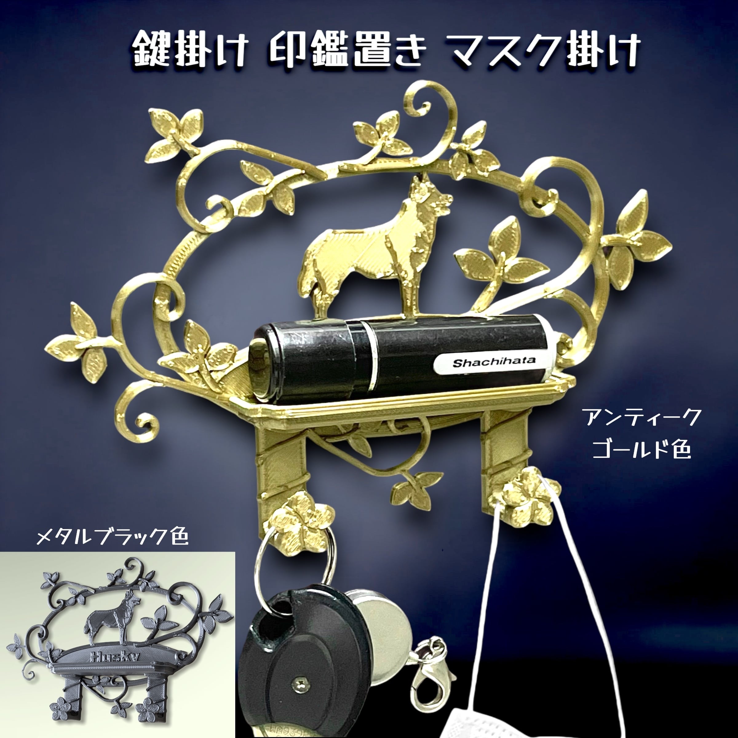 シベリアンハスキーのシルエットが可愛い、鍵掛け・印鑑置き・マスク掛け等の機能の付いたドアプレートです。