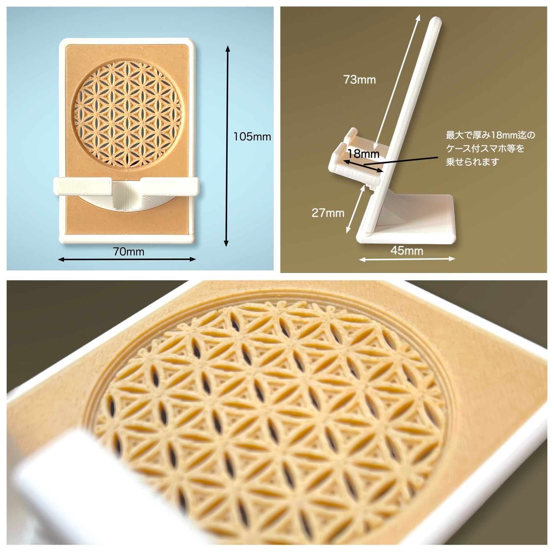 フラワーオブライフ模様の立体造形(木片入り樹脂製)が埋め込まれている癒やしのスマホスタンドです。