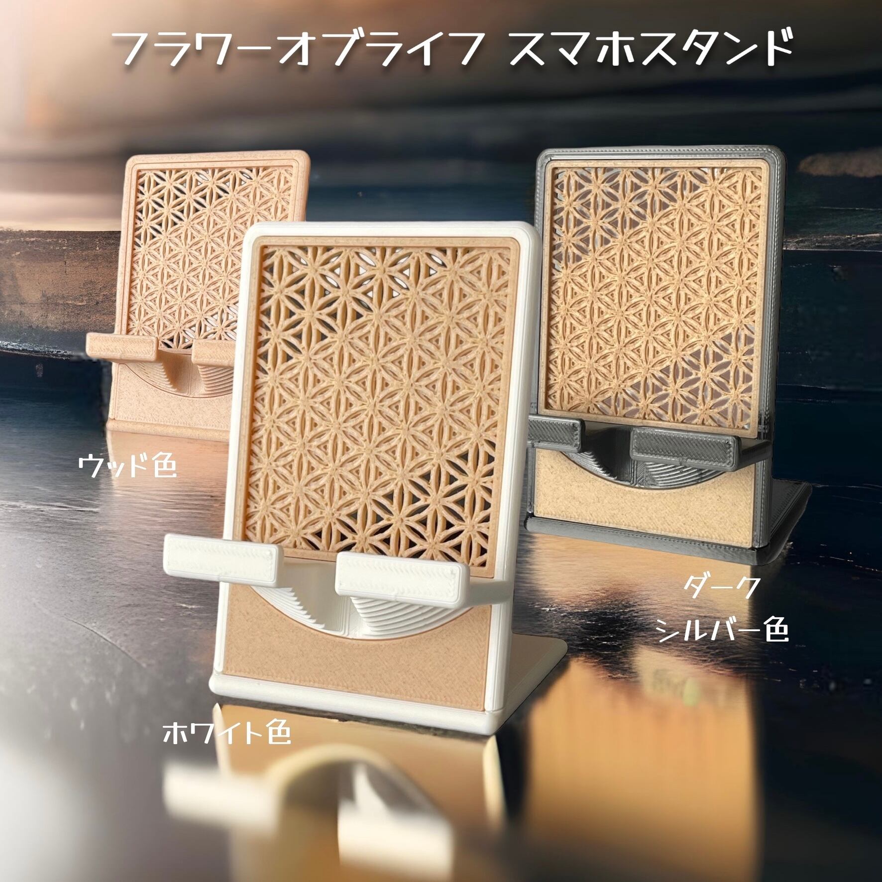 フラワーオブライフ模様の立体造形(木片入り樹脂製)が埋め込まれている癒やしのスマホスタンドです。