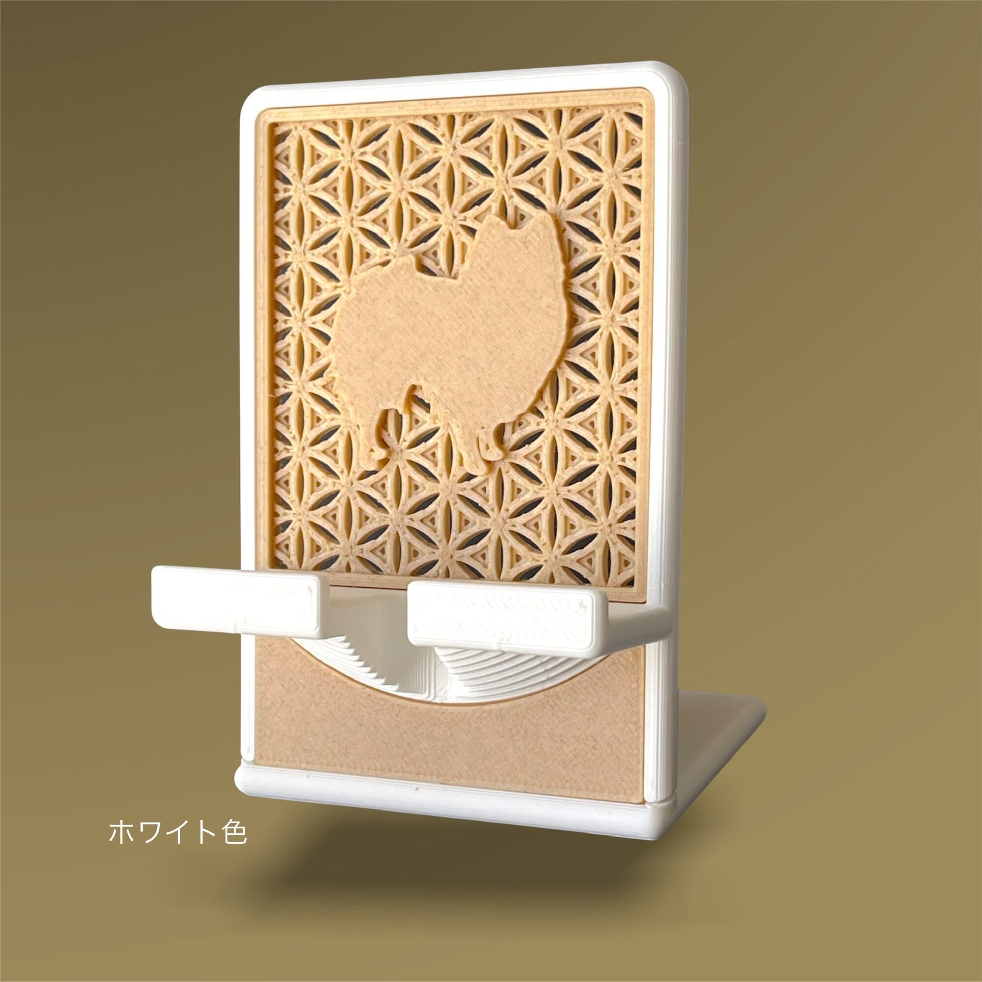 ポメラニアンのシルエットの立体造形(木片入り樹脂製)が埋め込まれている癒やしのスマホスタンドです。
