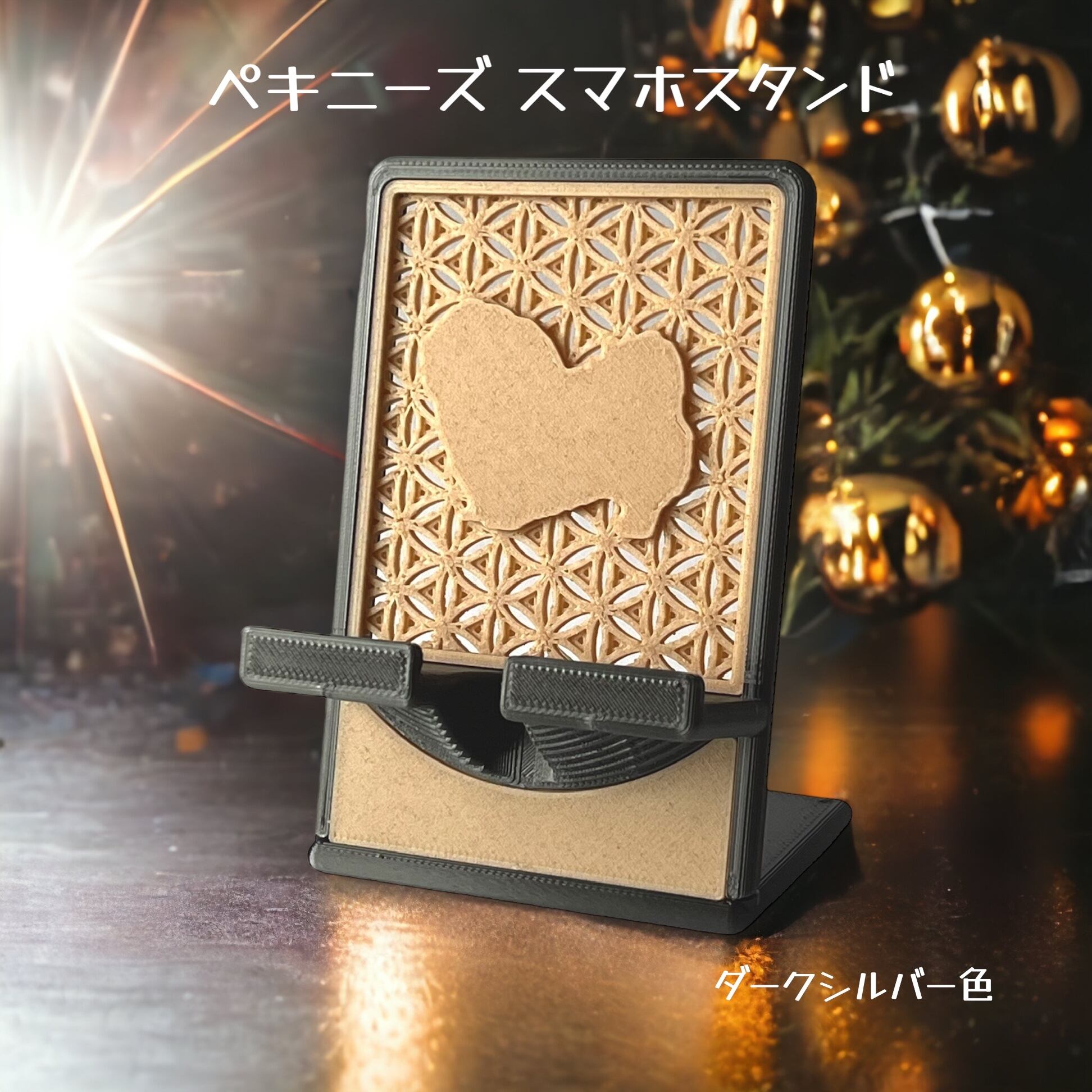 ペキニーズのシルエットの立体造形(木片入り樹脂製)が埋め込まれている癒やしのスマホスタンドです。