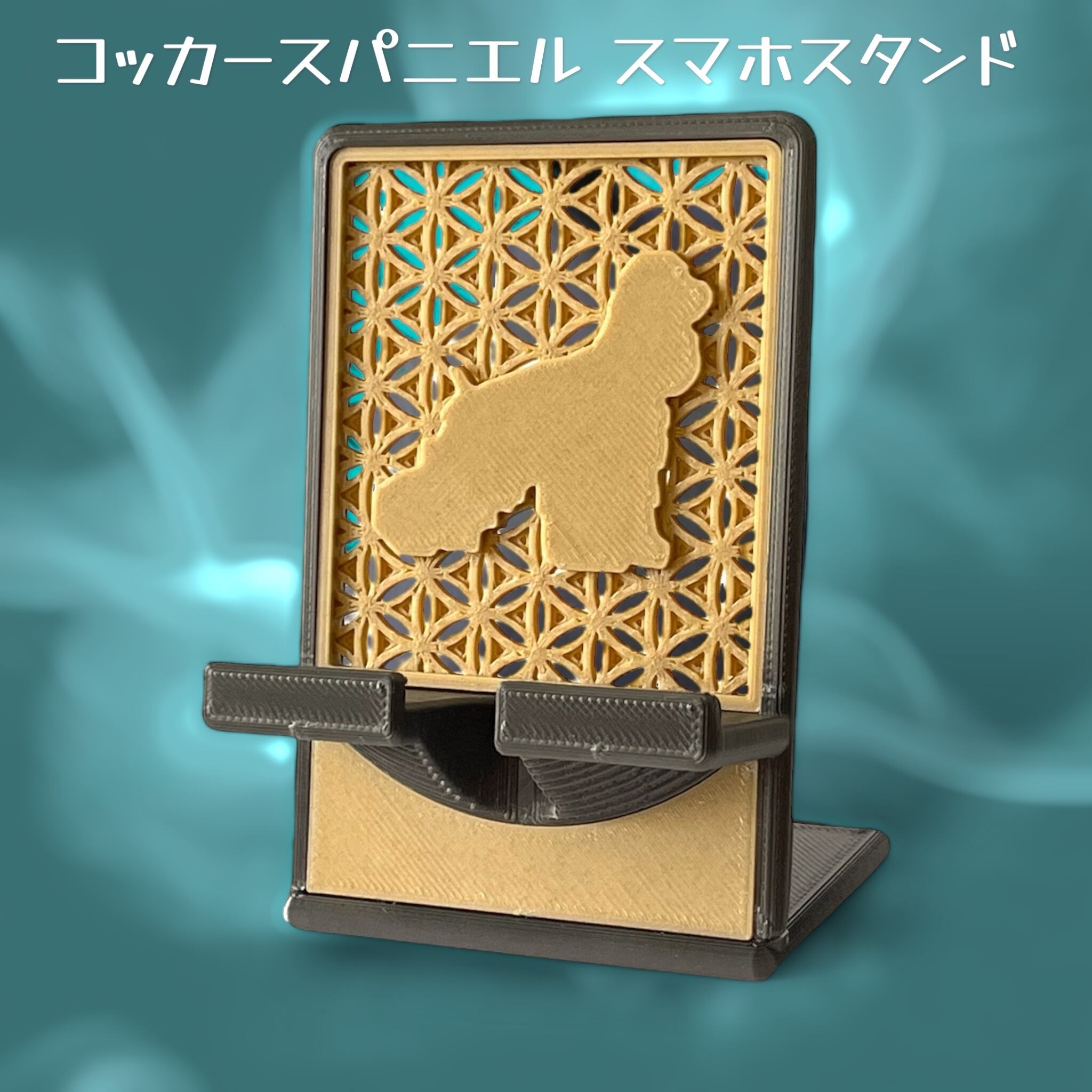 コッカースパニエルのシルエットの立体造形(木片入り樹脂製)が埋め込まれている癒やしのスマホスタンドです。