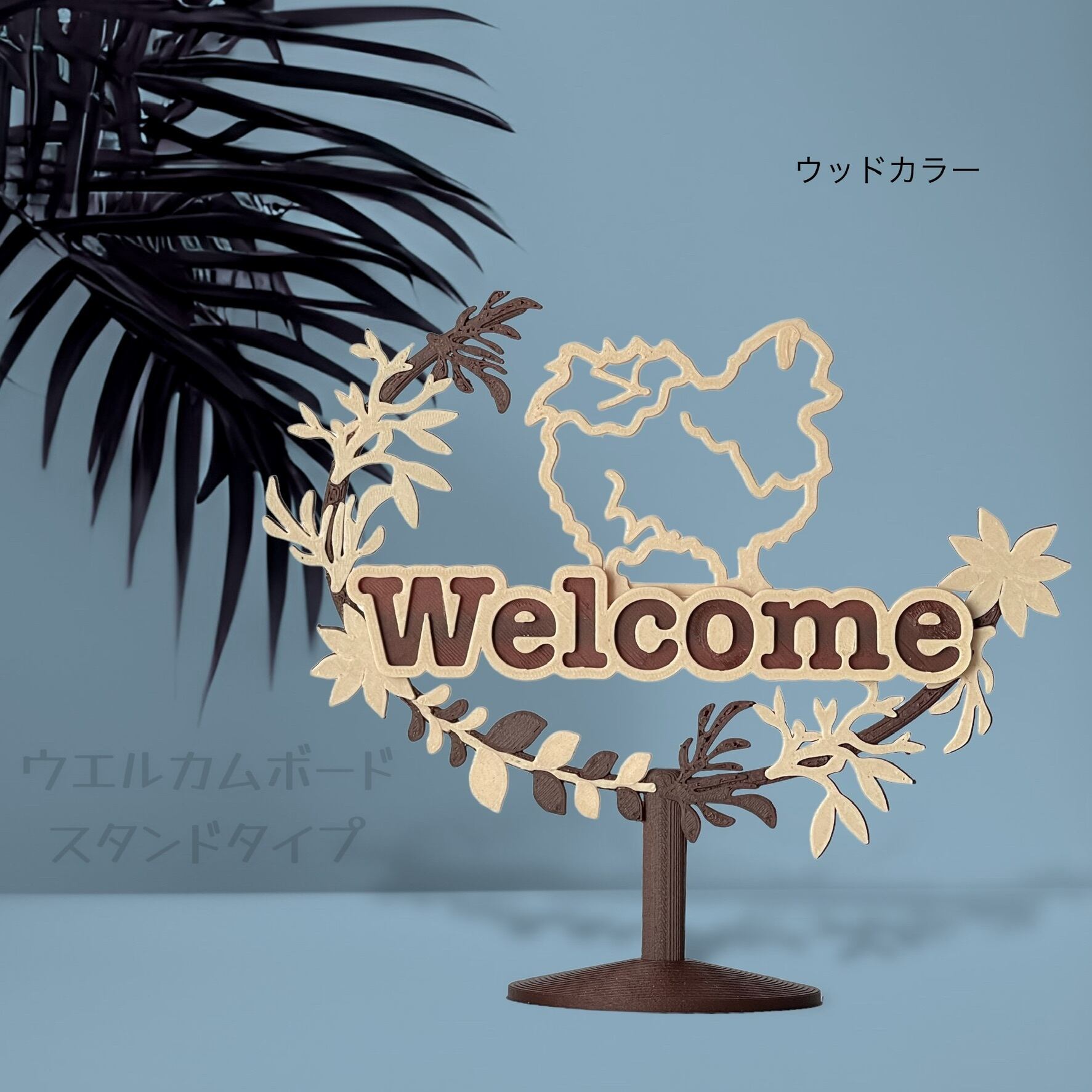 ポメラニアンのシルエットとwelcomeの文字の入ったインテリアオブジェです。