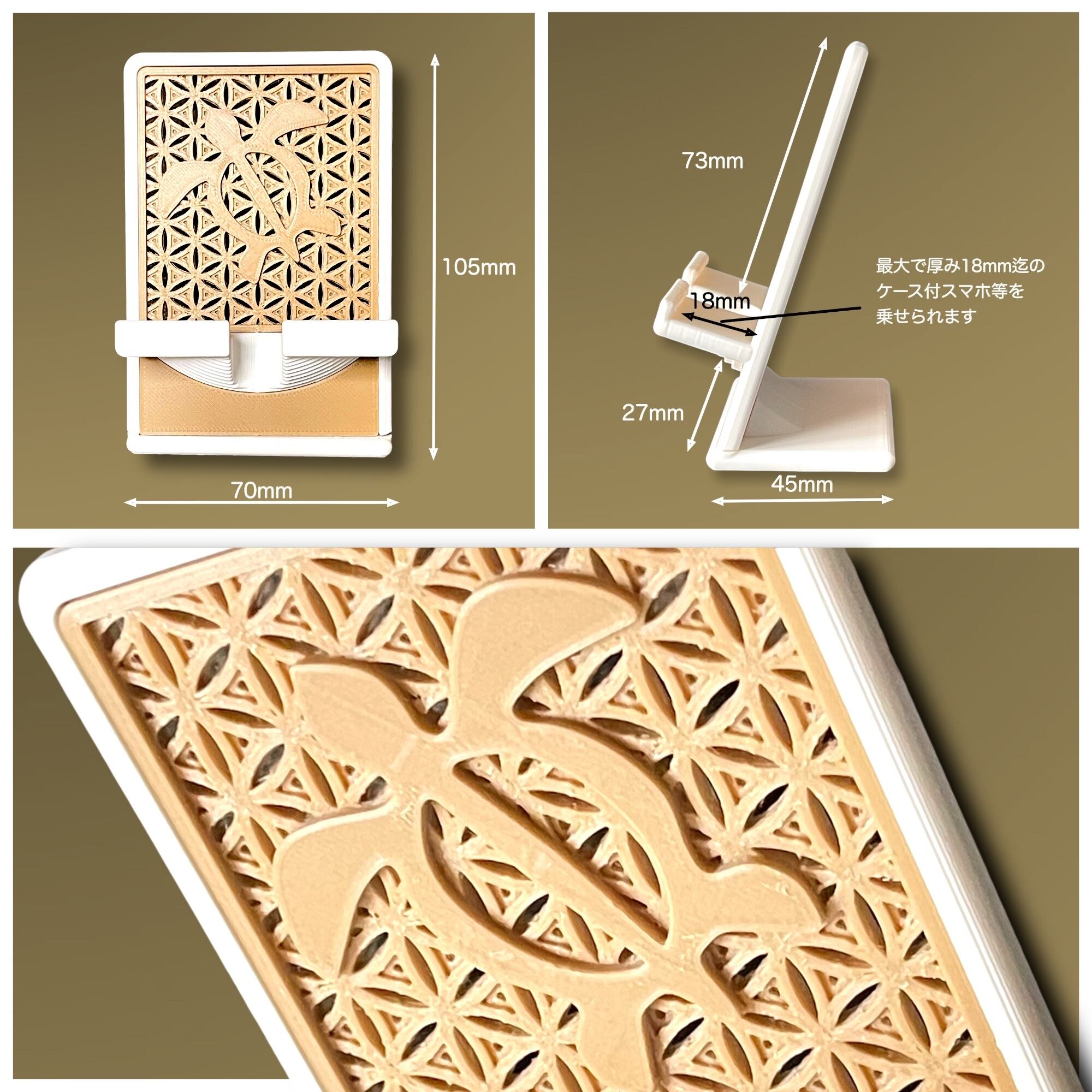 ・厚みのある手帳タイプ等のケース(厚み1.8cm迄)を付けていてもしっかりと置くことができます